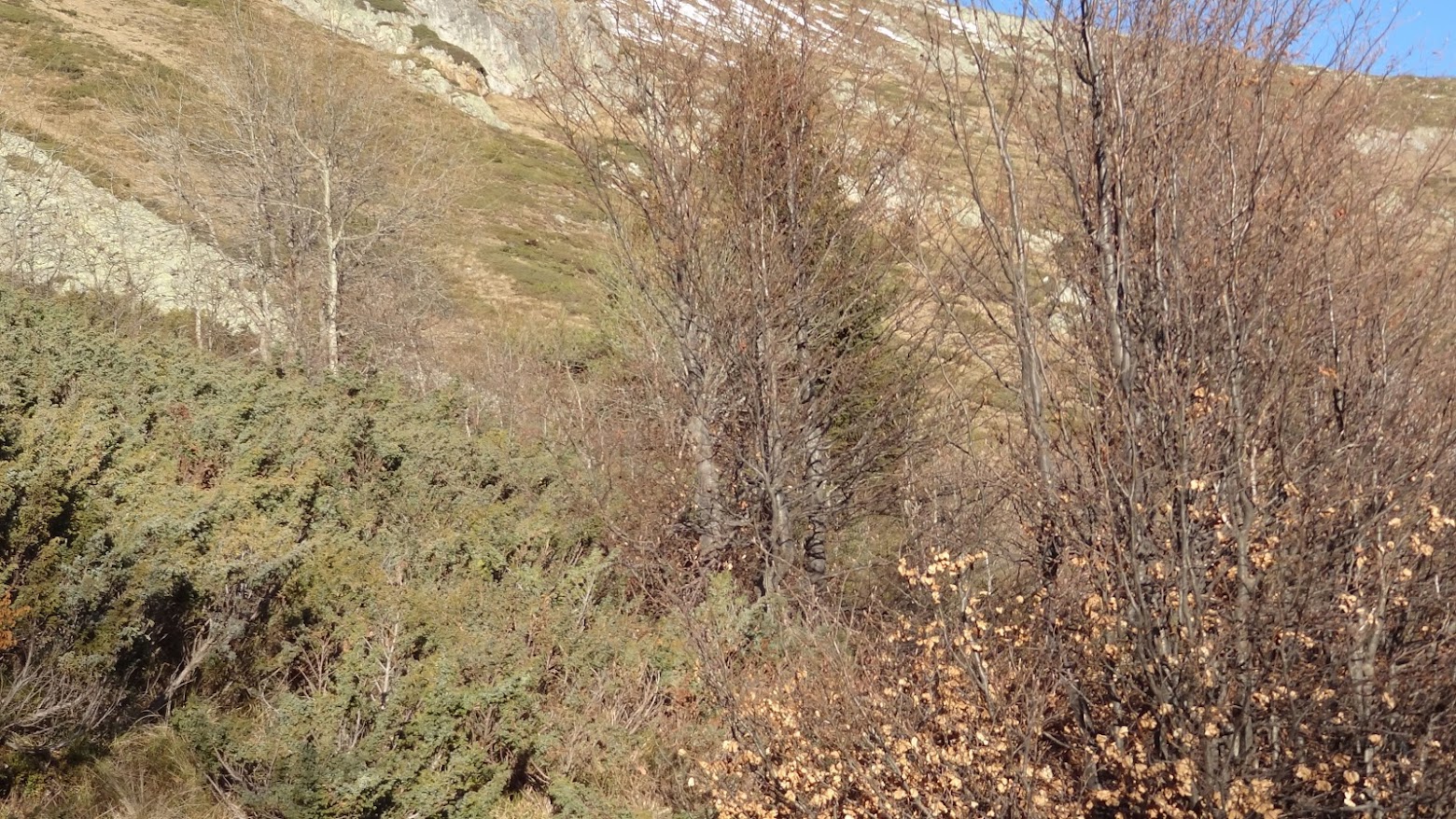 На 8.11.2020 г. ходих от с. Железница до х. Физкултурник. От там реших, че е подходящ момент да премина през местността Казана и да стигна по хоризонталната пътека до вр. Белчова скала и да сляза надолу покрай з. Синята стрела. Въпросната пътека на места се губи, а на места добре си личи, но като цяло се е позаличила и се преминава през трева/хвойна. Поне по това време на годината нямаше проблеми с преминаването. Точно по средата, там където пътеката преминава близко до горния край на гората видях 3-4 сърнички, които като ме усетиха хукнаха надолу към гората. За съжаление не успях да ги снимам, но ето на този кадър някое от кафевите петна може и да се една от тях. Техния кафяв цвят много се сливаше с околните есенни цветове.