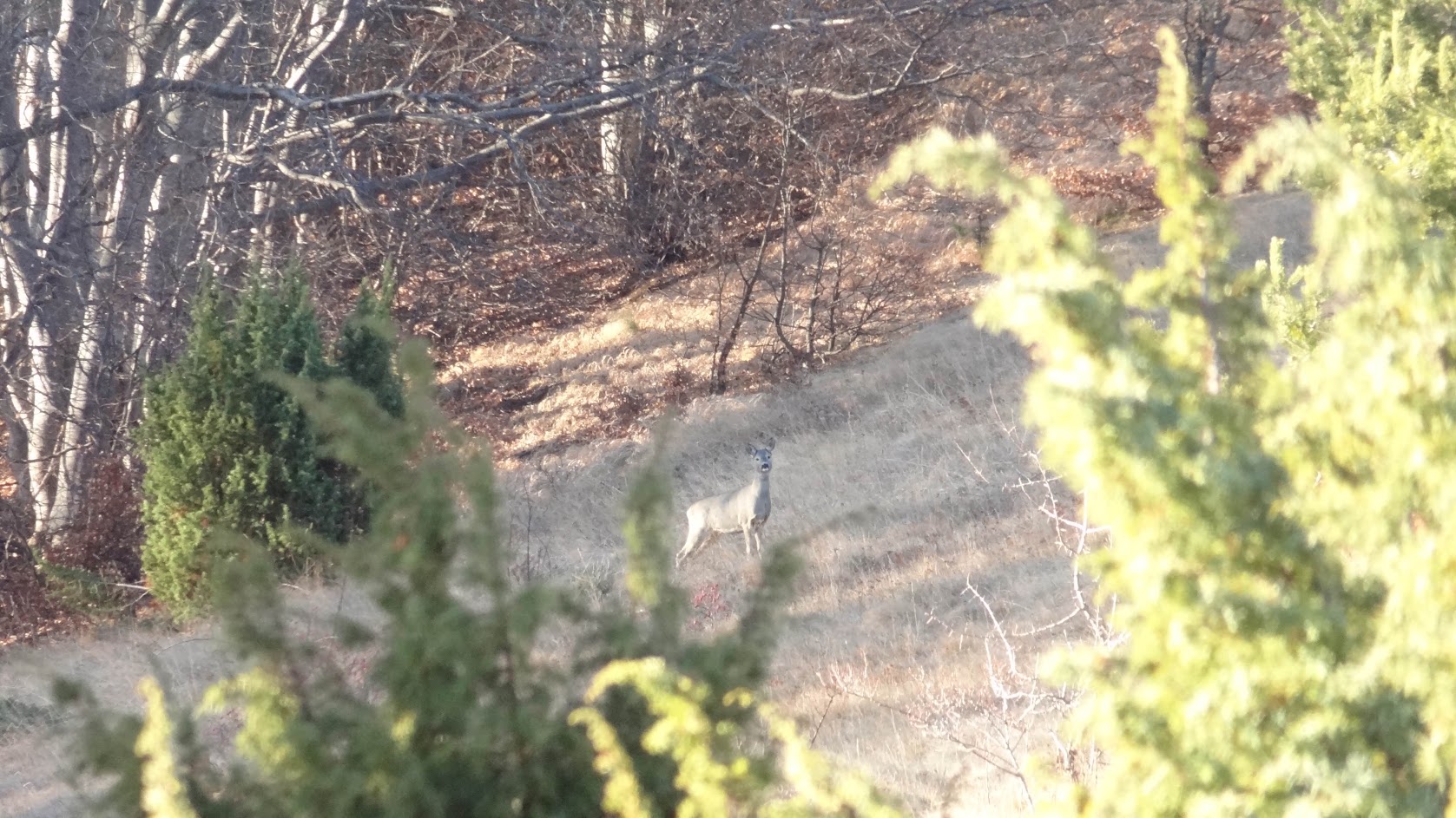 Всъщност, първата среща, за която ще спомена, беше в края на 2017 г. Тогава бях на разходка с още двама мои приятели на Витоша и се движехме от з. Кикиш към местността Комините. Някъде след каменистия участък в по-високата част на гората се бяхме отклонили от основната пътека, следвайки нещо като по-малка пътечка. На GPS-а видяхме, че основната пътеката е на около 100 метра над нас и реших да огледам местноста и да видя дали не е по-добре да тръгнем натам, вместо да разчитаме, че по-напред ще се съберат двете пътеки. Вървейки нагоре усетих, че нещо се движи на около 100-200 метра пред мен. Спрях и се огледах. В далечината видях сърна, но за жалост не можах да я снимам. Щом ме усети избяга с лекота и бързо я изгубих от поглед между дърветата.