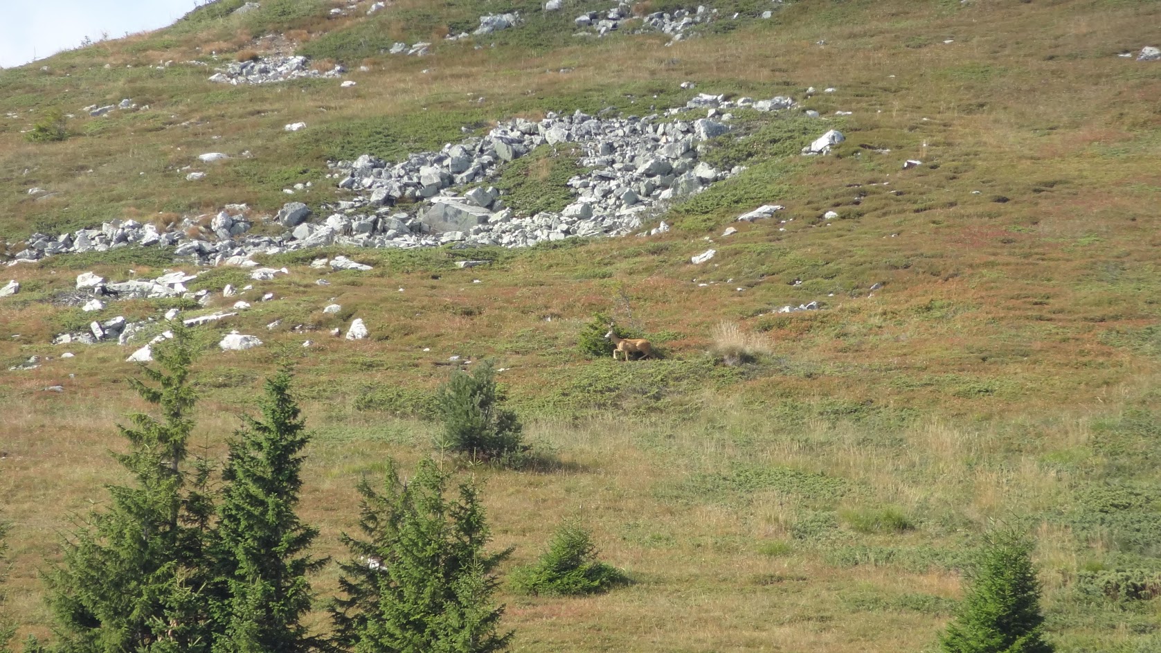 Поредната среща със сърнички беше в планината Рила и отново беше през месец октомври. Бяхме тръгнали с един приятел от ЦПШ Мальовица към Урдините езера и тъмно бяхме излезнали над горския пояс в началото на Зелени рид, когато забелязахме нещо странно на около 100-200 метра встрани от пътеката. Много приличаше на сърна, но доста дълго време стоеше неподвижно. Извадих фотоапарата и направих снимка със по-голям zoom. Оказа се сърна, която се препичаше на сутрешното слънце. След нея имаше още 2-3 представителя на този вид.