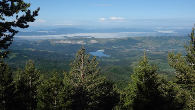 Участъкът между Симеоново и Бояна беше доста кален. По принцип времето през последните няколко седмици беше много лошо. Всеки ден имаше сериозни валежи и като цяло нашата разходка беше под въпрос, защото го правим за удоволствие и искахме да избегнем възможността да ни вали пороен дъжд през нощта или около нас да падат гръмотевици докато вървим по платото към Черни връх. В събота, когато по трасето мерят сили колоездачите, времето също беше много неприятно - няколко часа дъжд, придружен от гръмотевици. Но прогнозата за нощта срещу неделя и в неделя до обяд беше обещаваща. Повечето модели предвещаваха спокойна нощ и евентуални валежи чак в неделя следобед. Надявахме се да е така, но за всеки случай планирахме алтернативен маршрут за връщане. Ако на Черни връх мъглата беше твърде гъста или имаше изгледи да вали и гърми, мислехме да се върнем от Кладница през Офелиите и ниската част на Витоша. Е, времето този път беше с нас! Освен, че нямаше валежи и гръмотевици, беше супер ясно (поне до обяд) и видимостта също беше прекрасна и се насладихме на страхотните гледки от "другата" страна на Витоша. Например ето този изглед към яз. Студена: