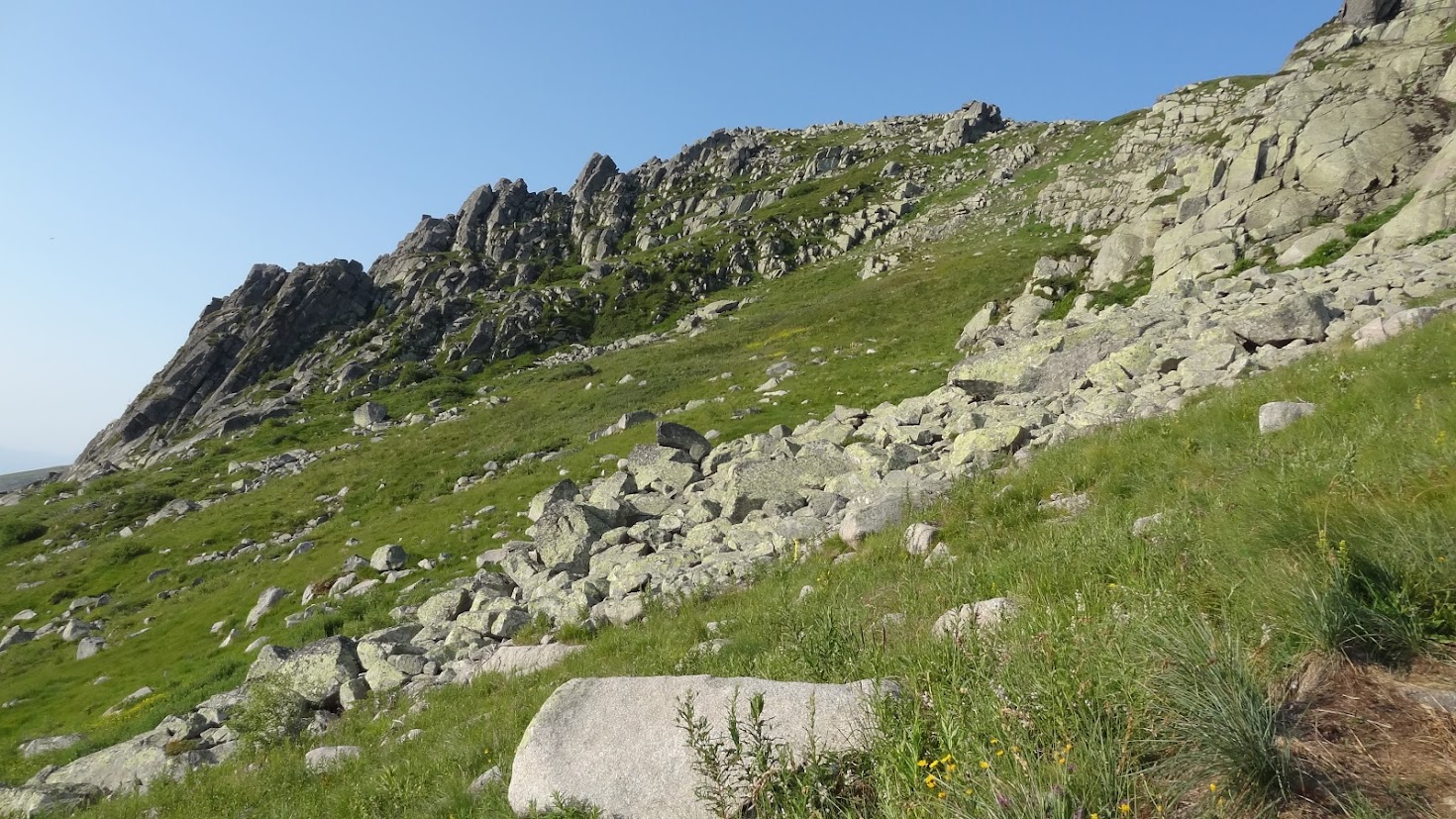 Най-лесният вариант за слизане от тук беше да се върна обратно до разклона в подножието на върха. Но вече няколко пъти бях слизал от Скопарника директно към пътеката за с. Железница. Разстоянието не е голямо, но се върви без пътека по клатещи се камъни и по тревист терен. В този момент ми хрумна, че мога да продължа до вр. Карачаир и от там да се спусна към основната пътека за с. Железница. Там поне на картата има отбелязана пътечка, макар че вече два или три пъти съм минавал по нея и знаех, че пътеката е трудно проследима и сигурно пак ще вървя без пътека. И при двата варианта преминаването щеше да е подобно, та макар и удължавайки си малко маршрута, реших да отскоча и до вр. Карачаир. Разстоянието между двата върха е около 500 метра и е почти равно и доста лесно за вървене, дори без много добре изразена пътека.