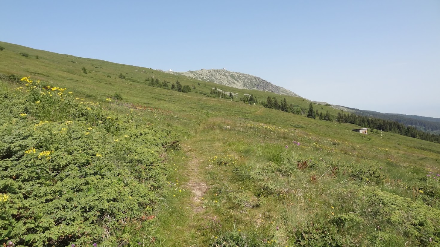 От тук тръгнах право надолу към главната пътека за с. Железница. Опитвах да следвам пътечката на картата с помощта на GPS, но в крайна сметка вървях в нищото без пътека. Преминава се през сравнително ниска трева, боровинкови храсти, хвойна и камъни. Долу в далечината е х. Физкултурник.