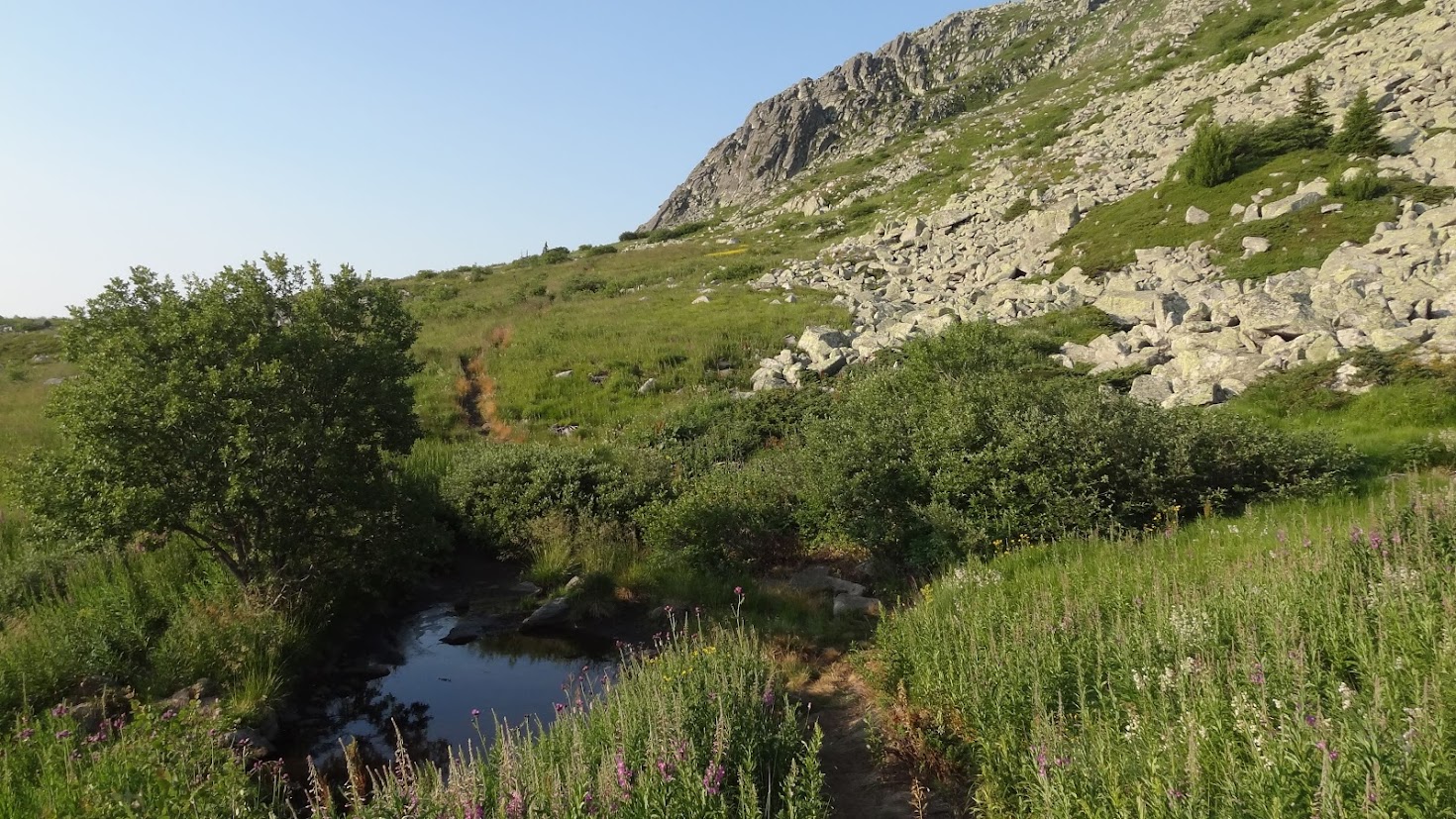 Вече бях на малко по-ниско (на около 1900 м.н.в.), нямаше вятър, а слънцето вече стоеше по-високо. С две думи - настана жега. Хубаво беше, че тук пътеката минава през поредица от поточета и при всяко от тях си мокрех главата и косата със свежа планинска вода. При по-дълги преходи на слънце си нося шапка, но днес не я бях взел, защото уж тръгнах по-рано и планът беше да съм на открито само 2-3 часа.